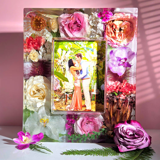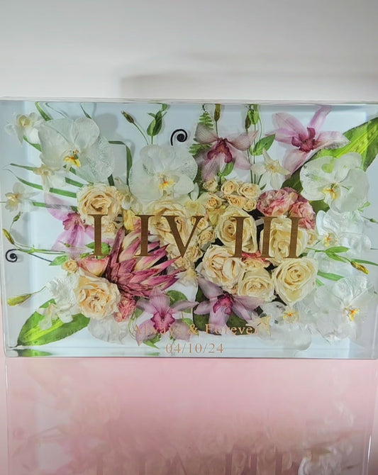 Having your flowers preserved in a resin cast not only saves them for you to admire forever, but is also a beautiful piece of art for your home and your new life together.