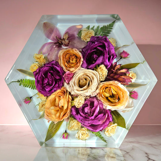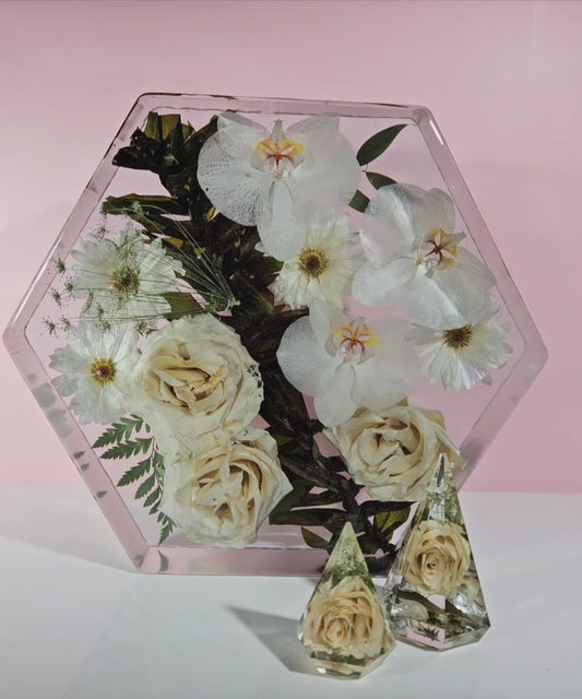Having your flowers preserved in a resin cast not only saves them for you to admire forever, but is also a beautiful piece of art for your home and your new life together.